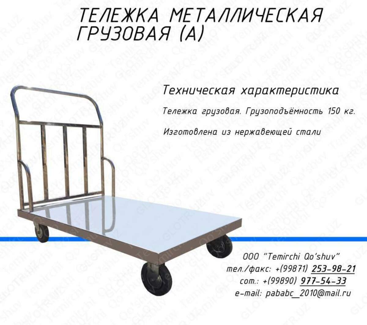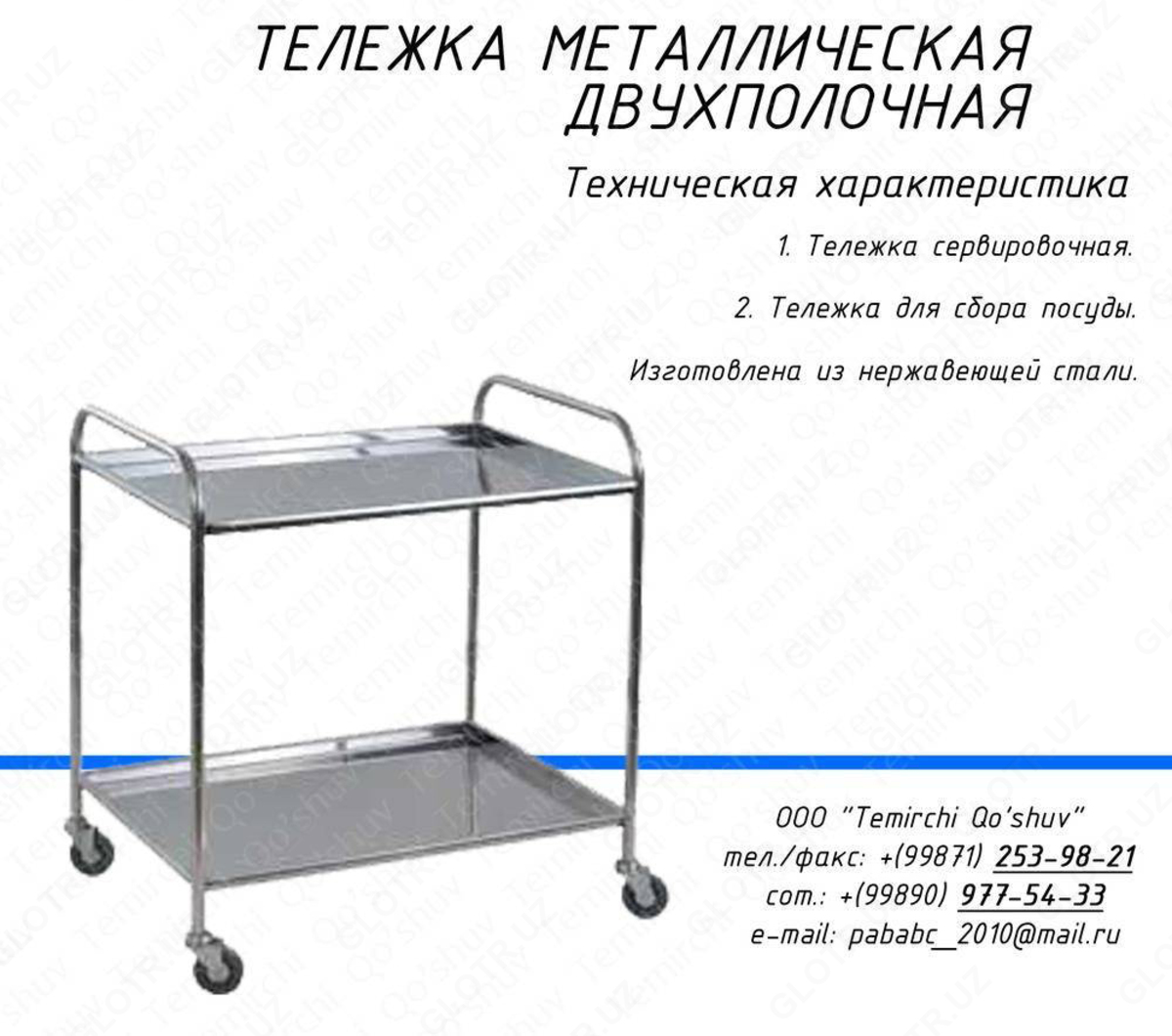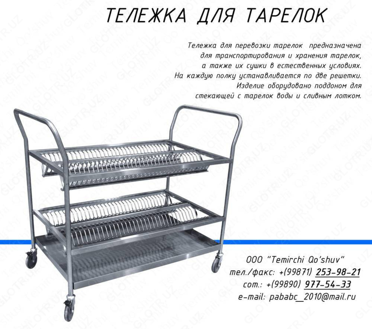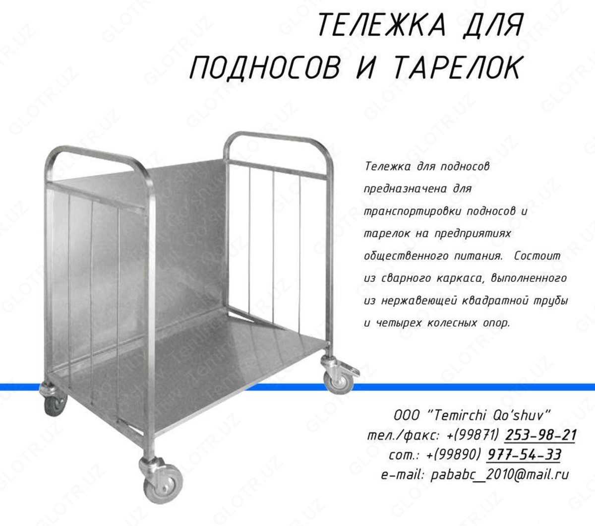 На складах, в цехах, столовых и других предприятиях ежедневно возникает необходимость перемещения разных грузов с места на место. Надёжные специализированные тележки в этом деле – незаменимые помощники. Мы предлагаем вам большой выбор данного вспомогательного оборудования. Тележки от компании OOO «Temirchi Qo’shuv», в зависимости от вида и конструкции, способны перевезти всё.