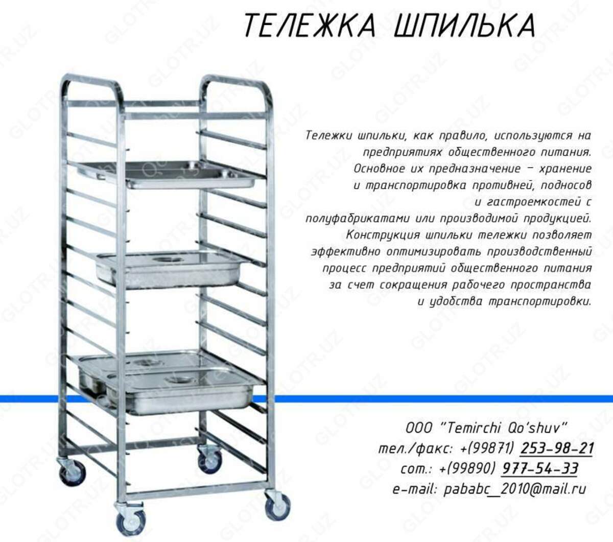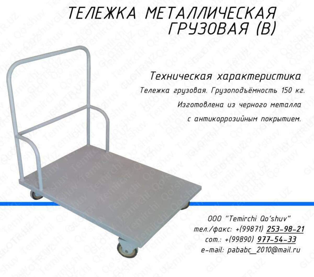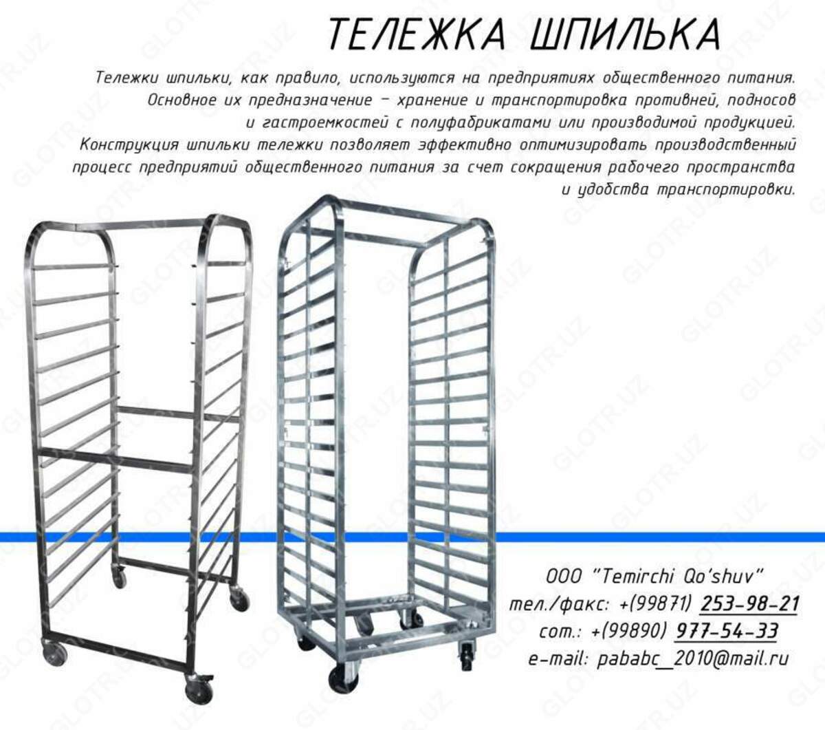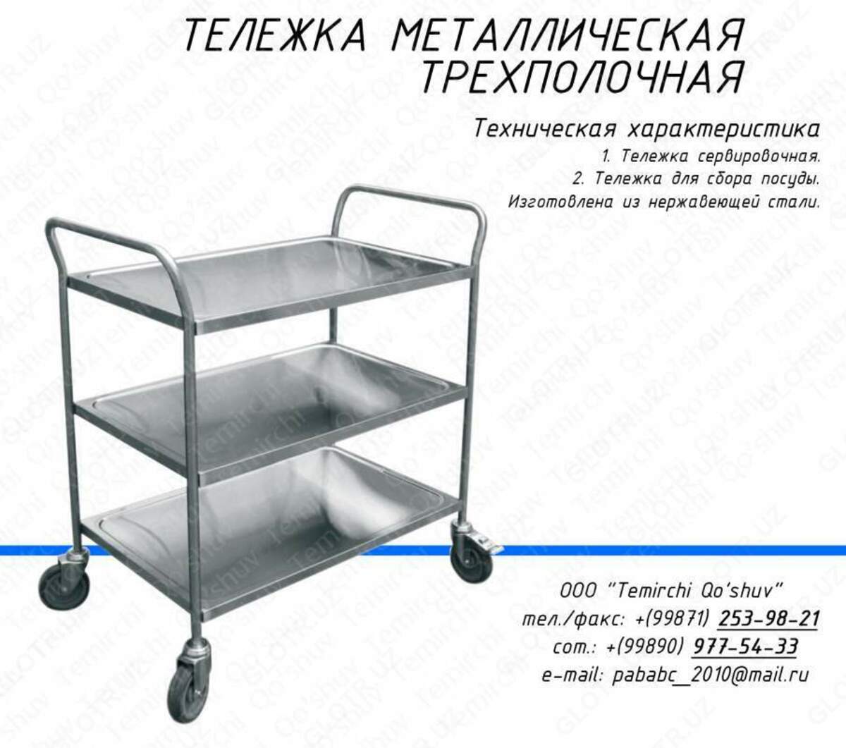 На складах, в цехах, столовых и других предприятиях ежедневно возникает необходимость перемещения разных грузов с места на место. Надёжные специализированные тележки в этом деле – незаменимые помощники. Мы предлагаем вам большой выбор данного вспомогательного оборудования. Тележки от компании OOO «Temirchi Qo’shuv», в зависимости от вида и конструкции, способны перевезти всё.